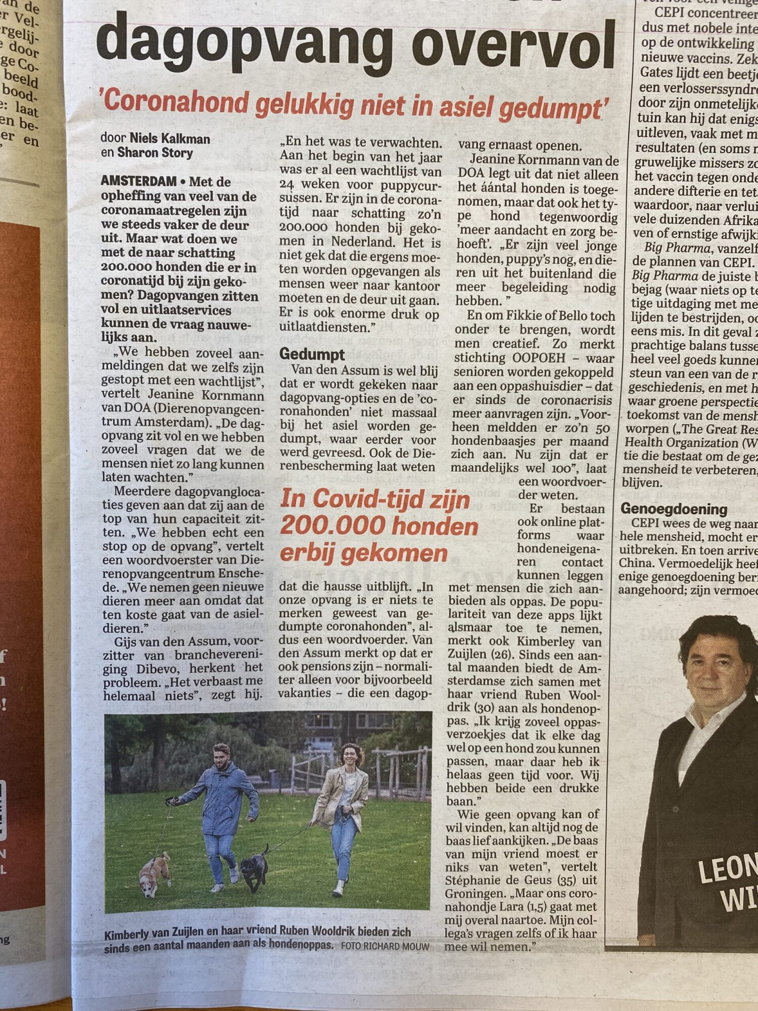 In de coronatijd zijn er naar schatting zo’n 200.000 honden bijgekomen in Nederland. En alle nieuwbakken baasjes die vanwege corona veelal thuis waren gaan inmiddels weer vaker naar kantoor of een dagje weg. Dat betekent grote drukte bij de uitlaatcentrales, de opvangen èn bij Stichting OOPOEH. In juni van dit jaar stuurden we samen met DOA Amsterdam een gezamenlijk persbericht uit om nieuwe baasjes op het hart te drukken op tijd te beginnen met het zoeken van een lieve oppas voor de hond. Dat wordt volop gedaan: het aantal aanmeldingen is groter dan ooit, veel hondenbaasjes hopen via Stichting OOPOEH een lieve ‘opa of oma’ te vinden voor hun viervoeter.